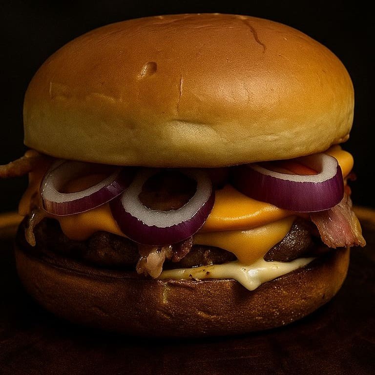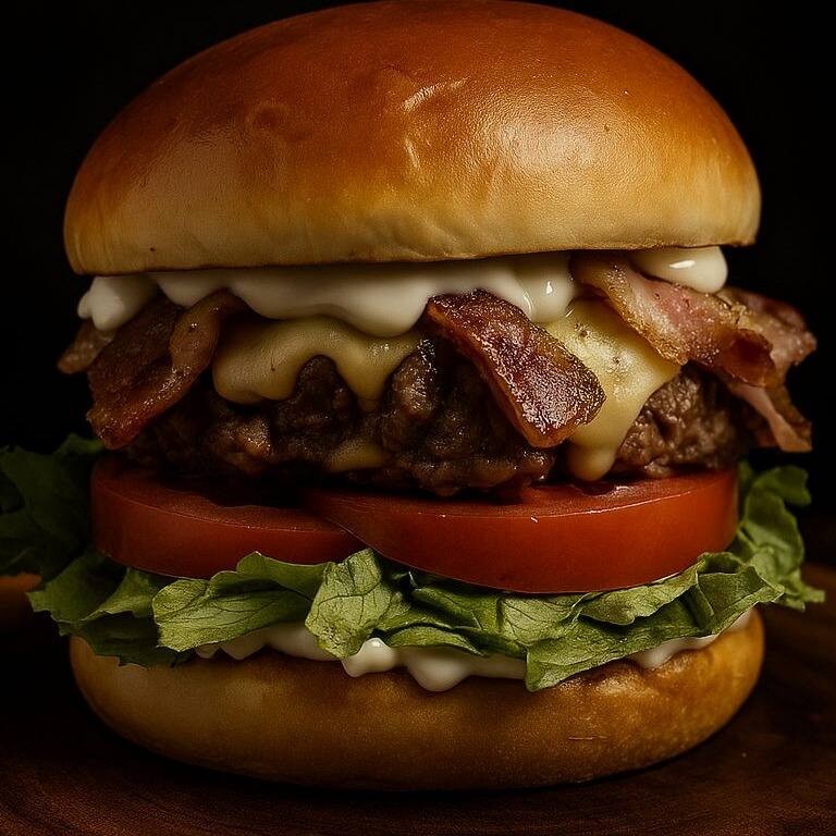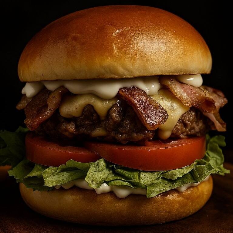 Pão (3 opções ) Hambúrguer 160g, Cheddar fatiado , Tomate, Bacon, Cebola roxa e Barbecue