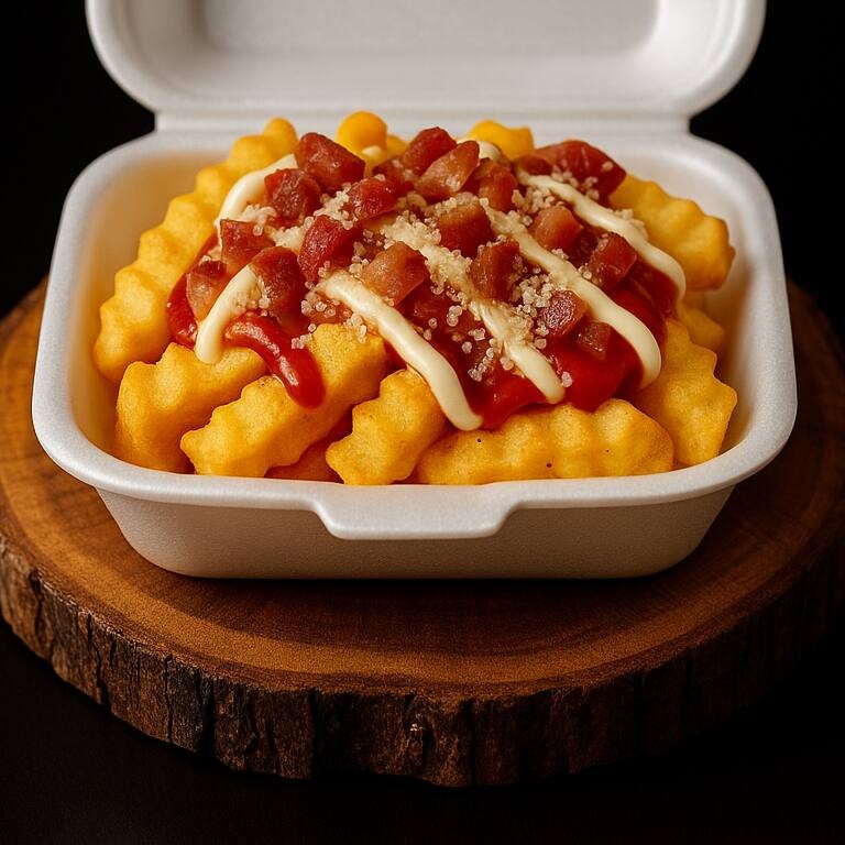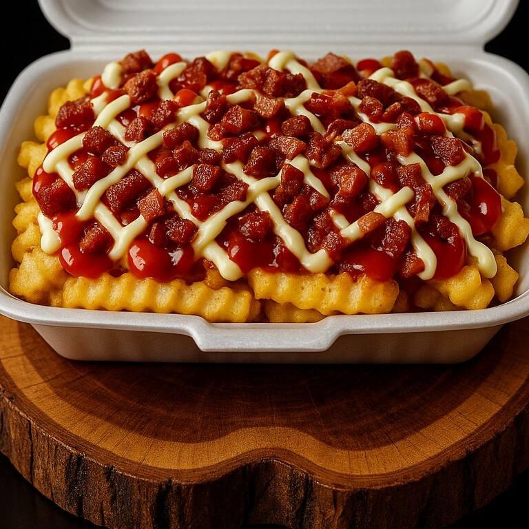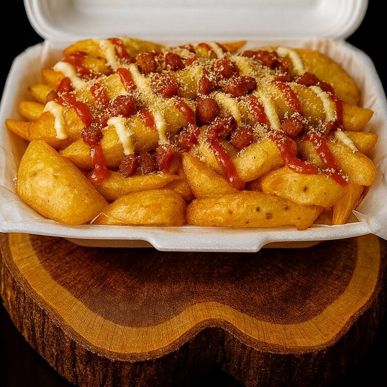 Batata Crinkle Pequena , bacon, maionese , ketchup, cheddar e queijo ralado