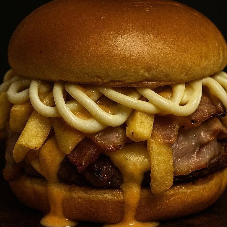 Pão ( 3 opção ) Hamburguer, cheddar, Molho da casa 1, cebola roxa, ketchup , Batata palha e bacon