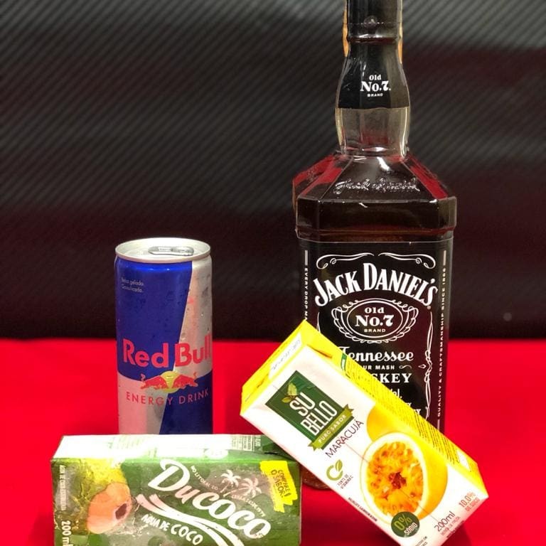 Combo Jack Daniels mel com redbull Acompanha 5 gelos (coco , maracuja ), 4 redbull