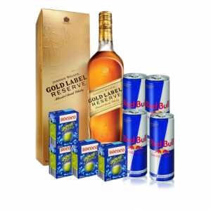 Whisky Gold Label + 4 Red bull + 4 Gelos Sococo + 4 Copos