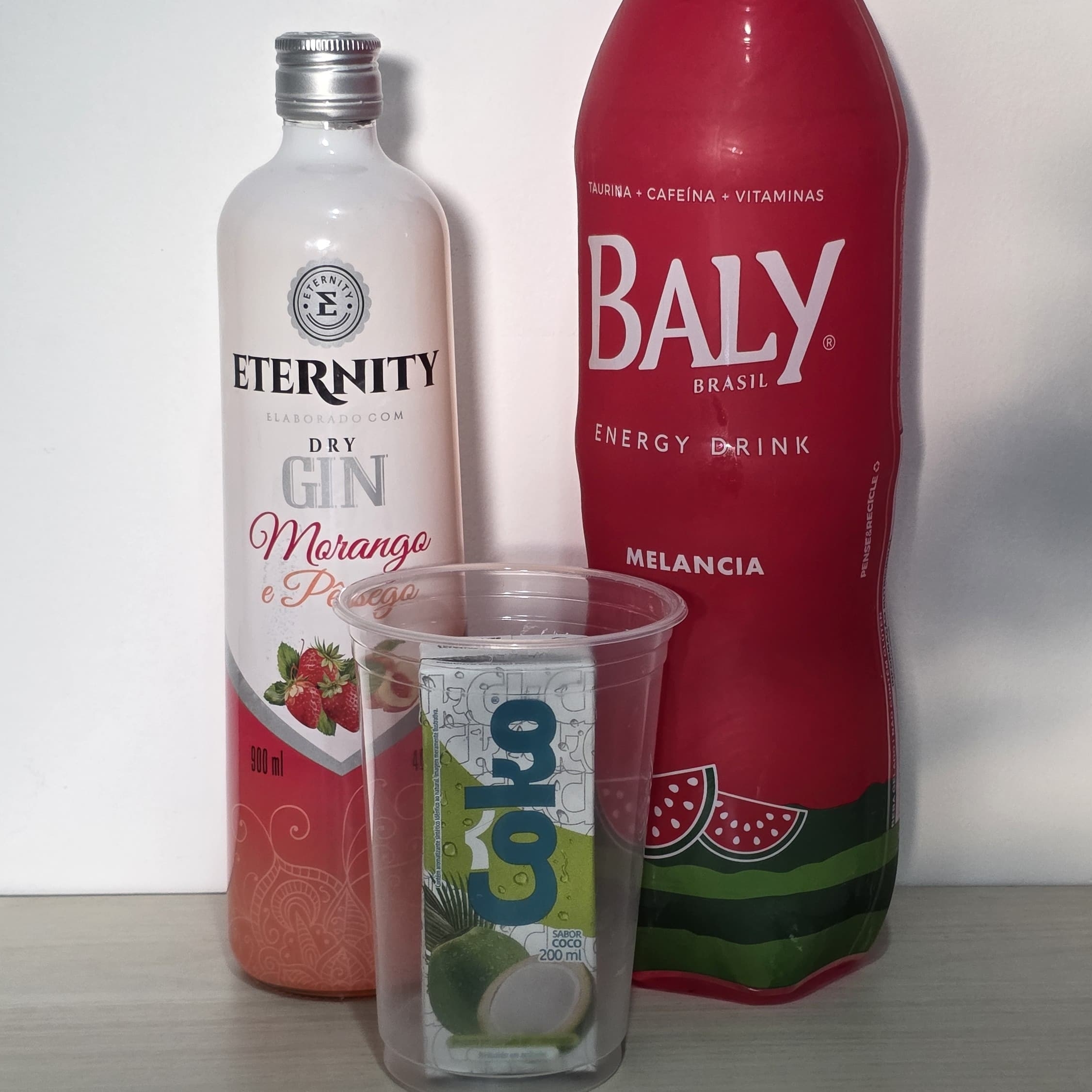 Gin de morango e pêssego + Energético de melancia + gelo de coco