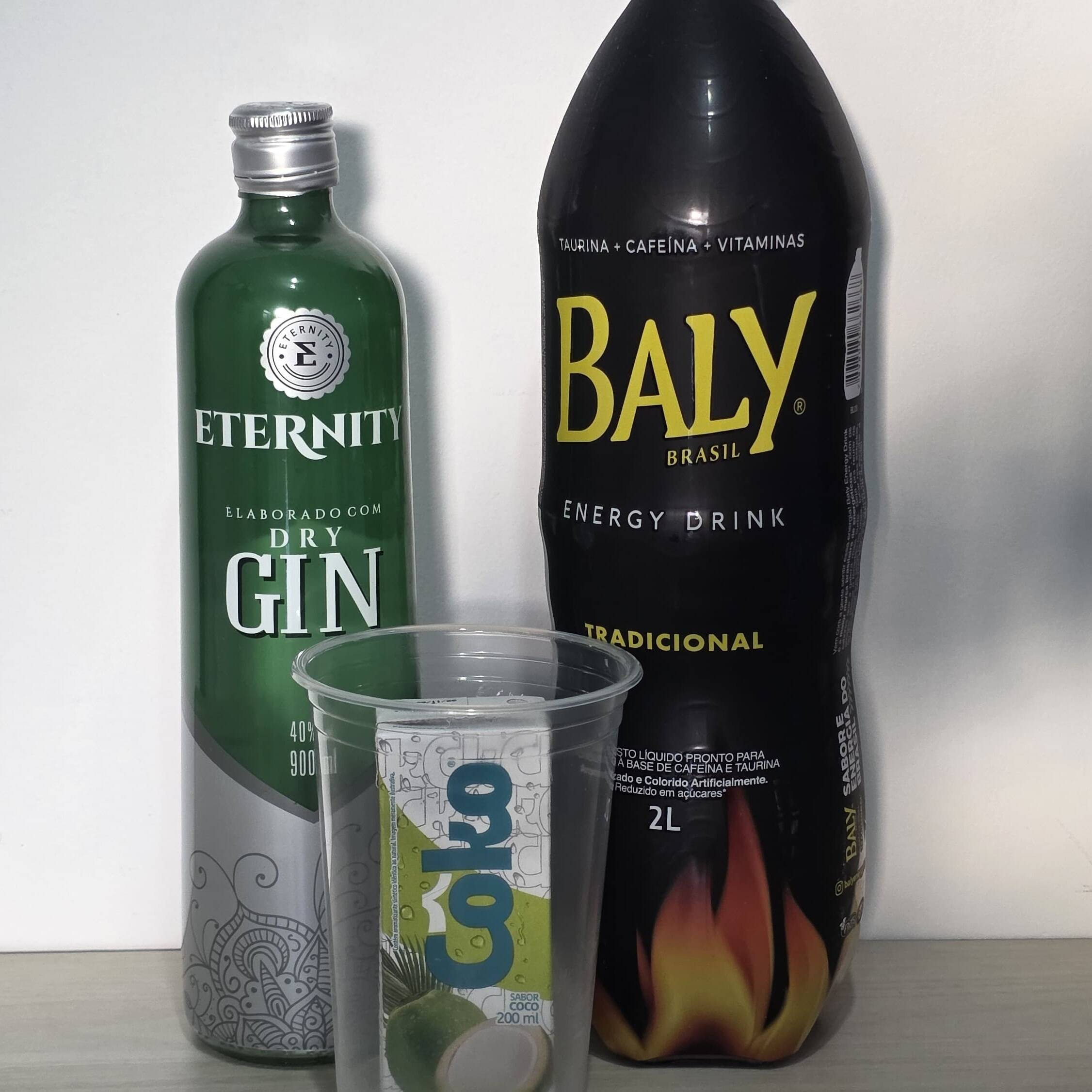 gin, energético, gelo de coco