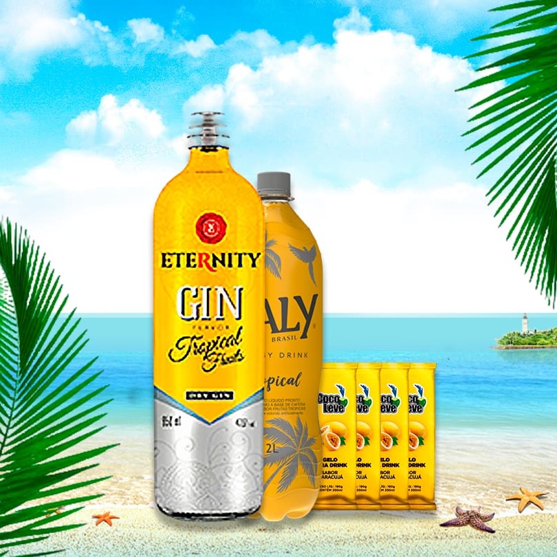 Acompanha: 1 Garrafa Gin Eternity Tropical + 1 Energético Tropical 2lts + 4 Gelos (Escolha o sabor nas observações), acompanha frutas congeladas. Acompanha 4 copos e canudos (Na falta do gin de sabor será enviado o tradicional/sem sabor) Kit Frutas enviado conforme a disponibidade.