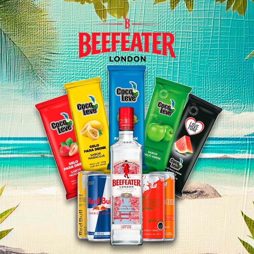 Combo de gin Beefeater London tradicional 750ml, acompanha energético Redbull, gelo de sabor e frutas congeladas. Kit fruta enviado de acordo com a disponibilidade.