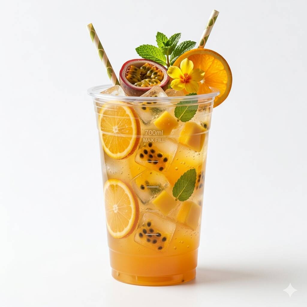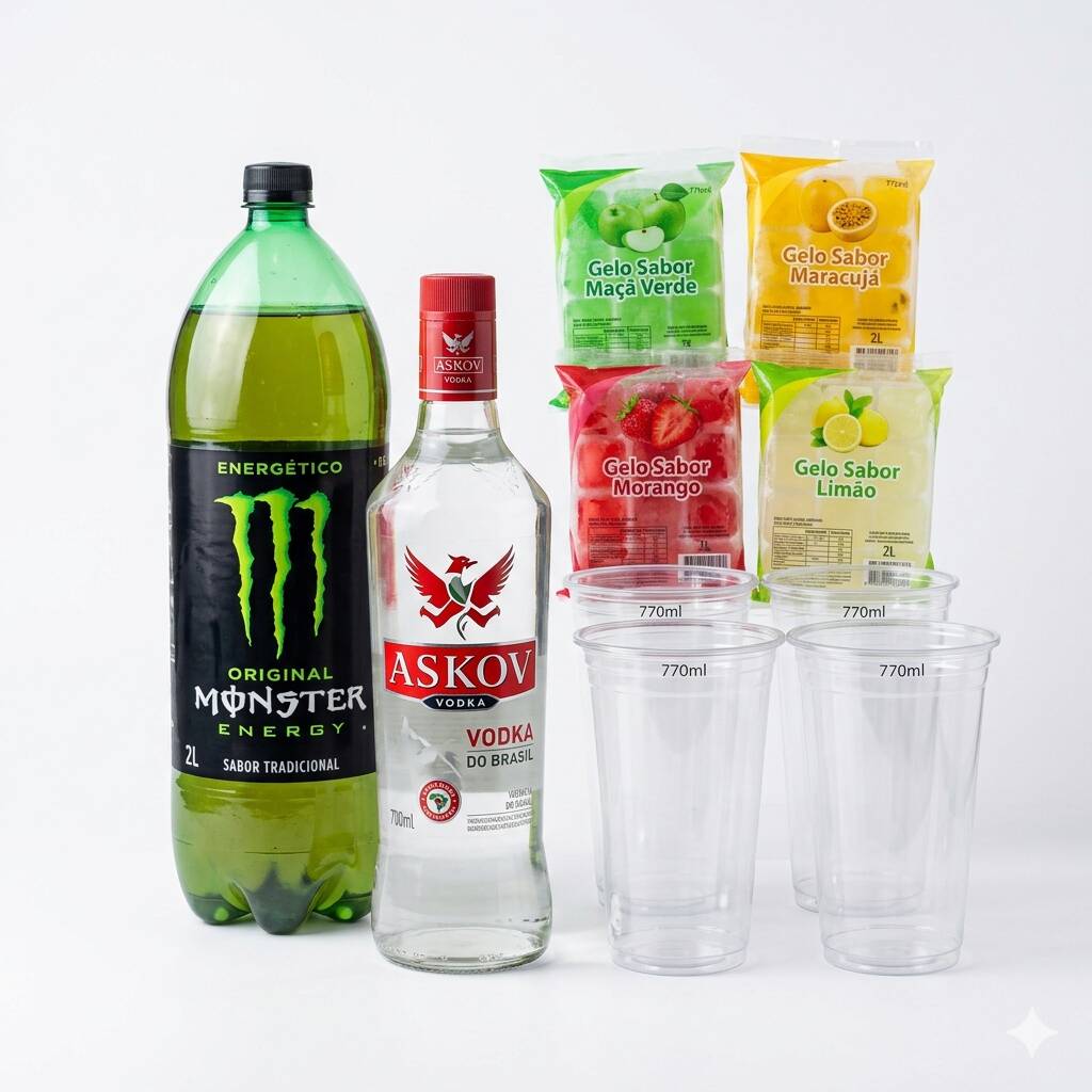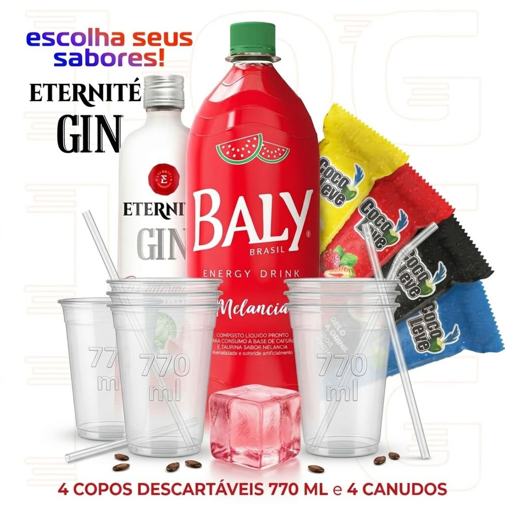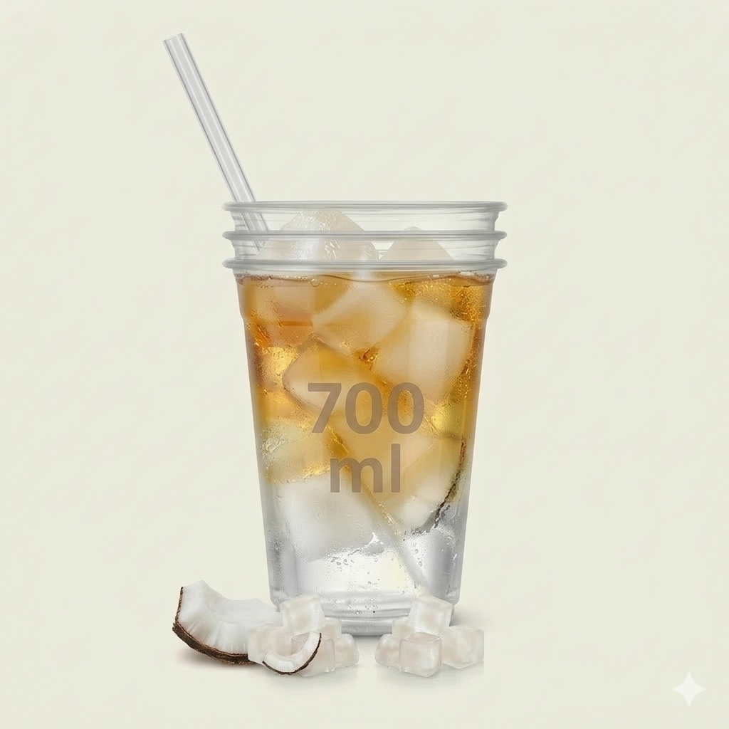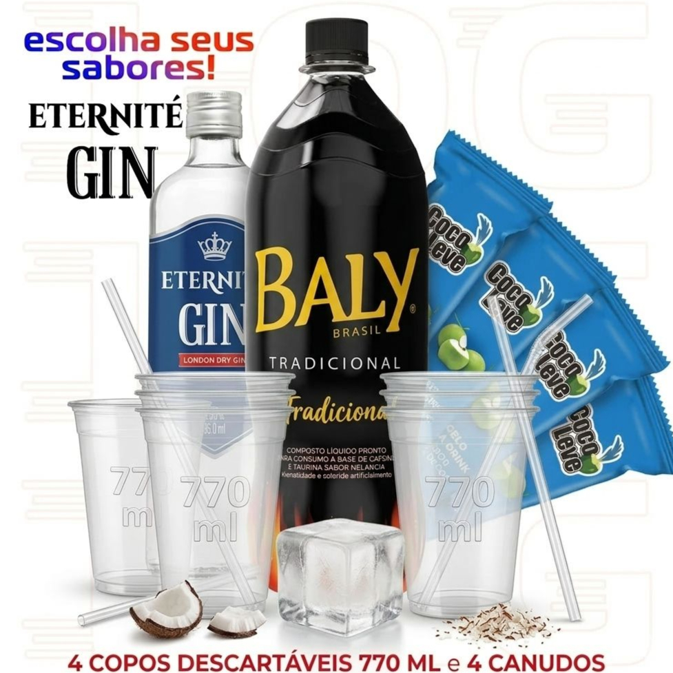 Acompanha 2 copos de 700 ml e 2 gelos de coco sabores