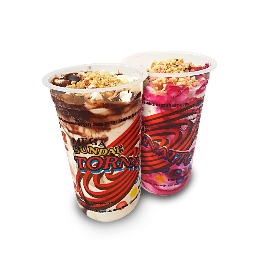 Mega sundae sabor baunilha com cobertura de chocolate e castanhas. mega sundae sabor baunilha com cobertura de morango e castanhas.
