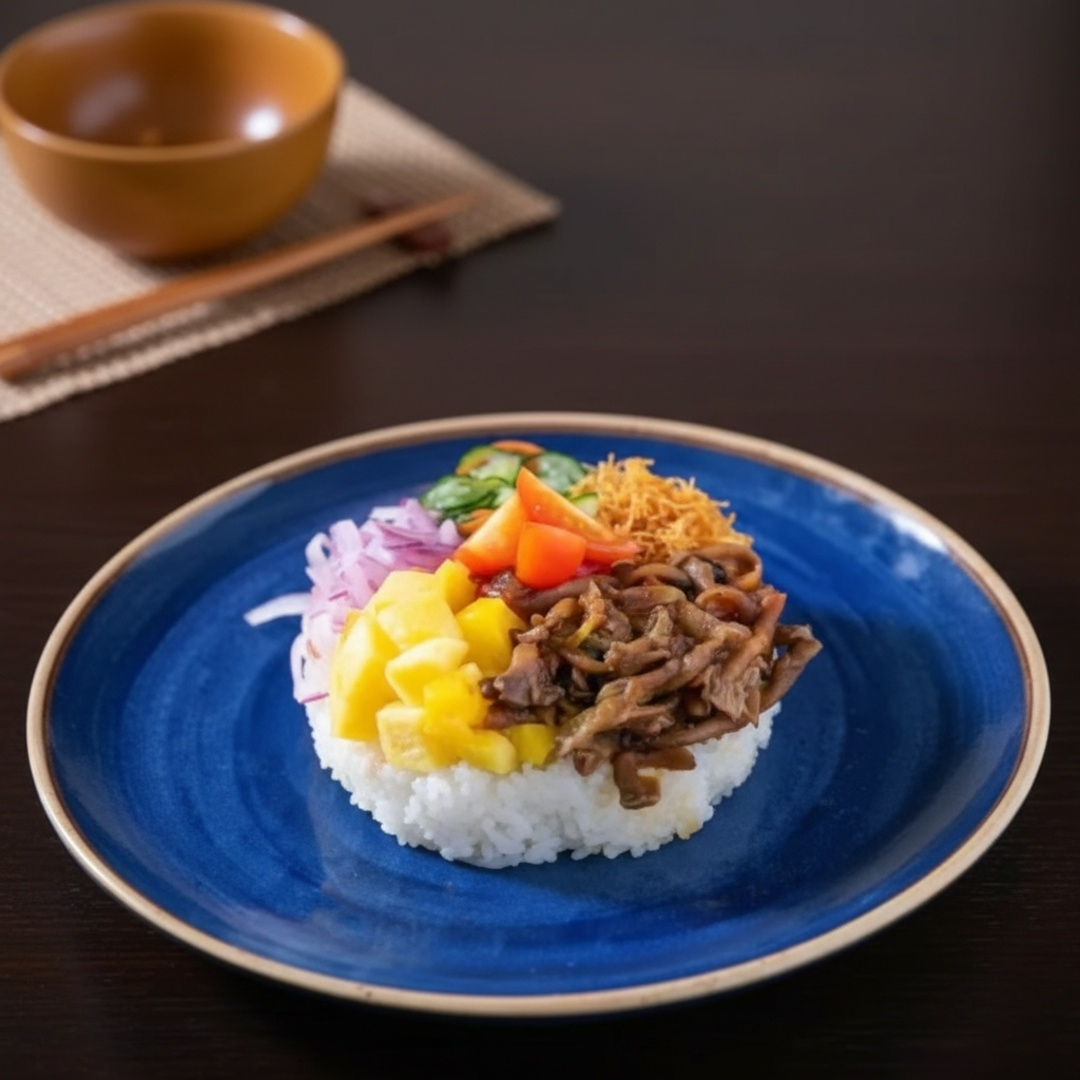 - Shimeji - Manga - Pepino ralado - Tomate cereja - Cebola - Arroz - Gergelim *Atenção* Não fazemos alterações!! Este pedido acompanha 2 hashi + 2 shoyu + 1 tarê.