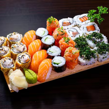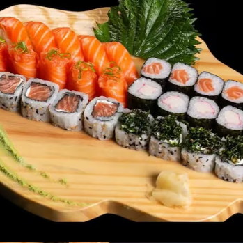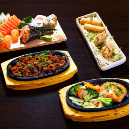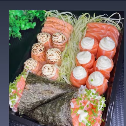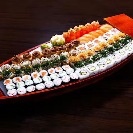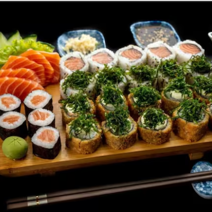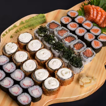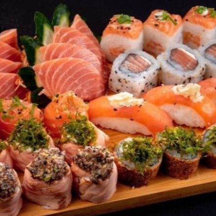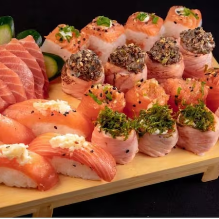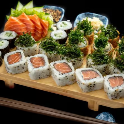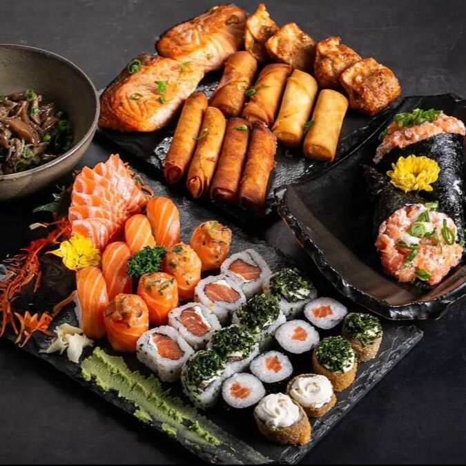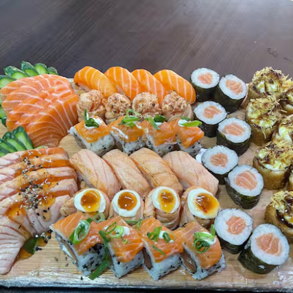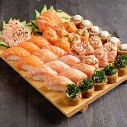 3 temaki a sua escolha .18 sashimis salmão .36 sushis variados .3 salmão grelhado .3 mini porção de shimeji .6 guiozas de carne bovina .3 rolinhos de queijo .3 rolinhos de legumes