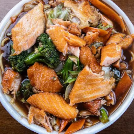 salmão - legumes - macarrão *Atenção* Não fazemos alterações!! Este pedido acompanha 2 hashi + 2 shoyu + 1 tarê.