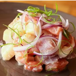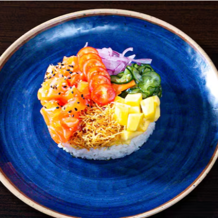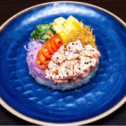 - Salmão cru- Manga - Pepino ralado - Tomate cereja - Cebola - Arroz - Gergelim *Atenção* Não fazemos alterações!! Este pedido acompanha 2 hashi + 2 shoyu + 1 tarê.