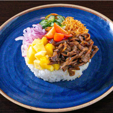 - Salmão flambado - Manga - Pepino ralado - Tomate cereja - Cebola - Arroz - Gergelim *Atenção* Não fazemos alterações!! Este pedido acompanha 2 hashi + 2 shoyu + 1 tarê.