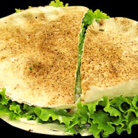 Feito com kafta assada,alface,tomate,pepino em conserva,cebola no pão libanes