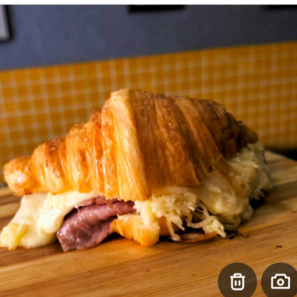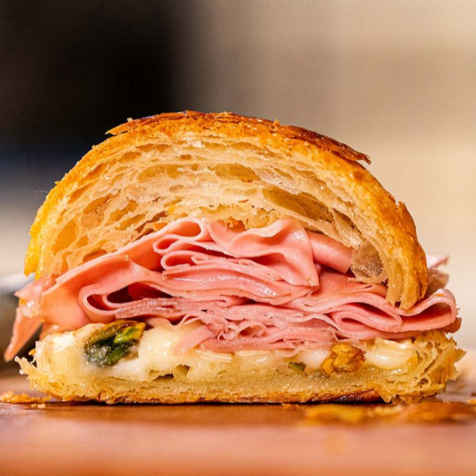 Croissant amanteigado recheado com mortadela fatiada, queijo derretido e um toque de pesto genovês artesanal.