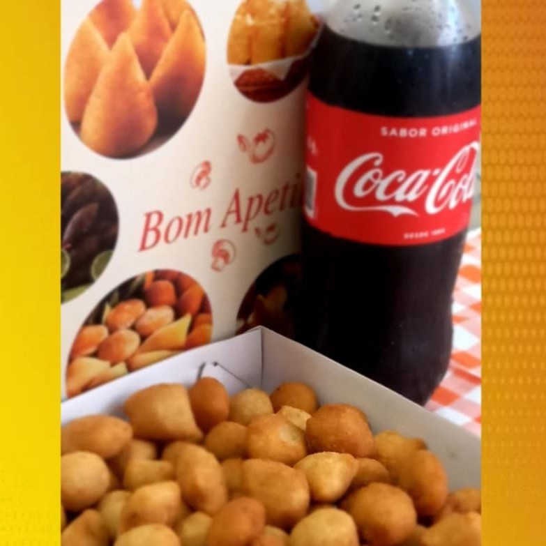 25 salgadinhos variados 25 gramas a unidade nos sabores coxinha, queijo, presunto e queijo, calabresa e salsicha mais uma coca cola 600ml geladinha