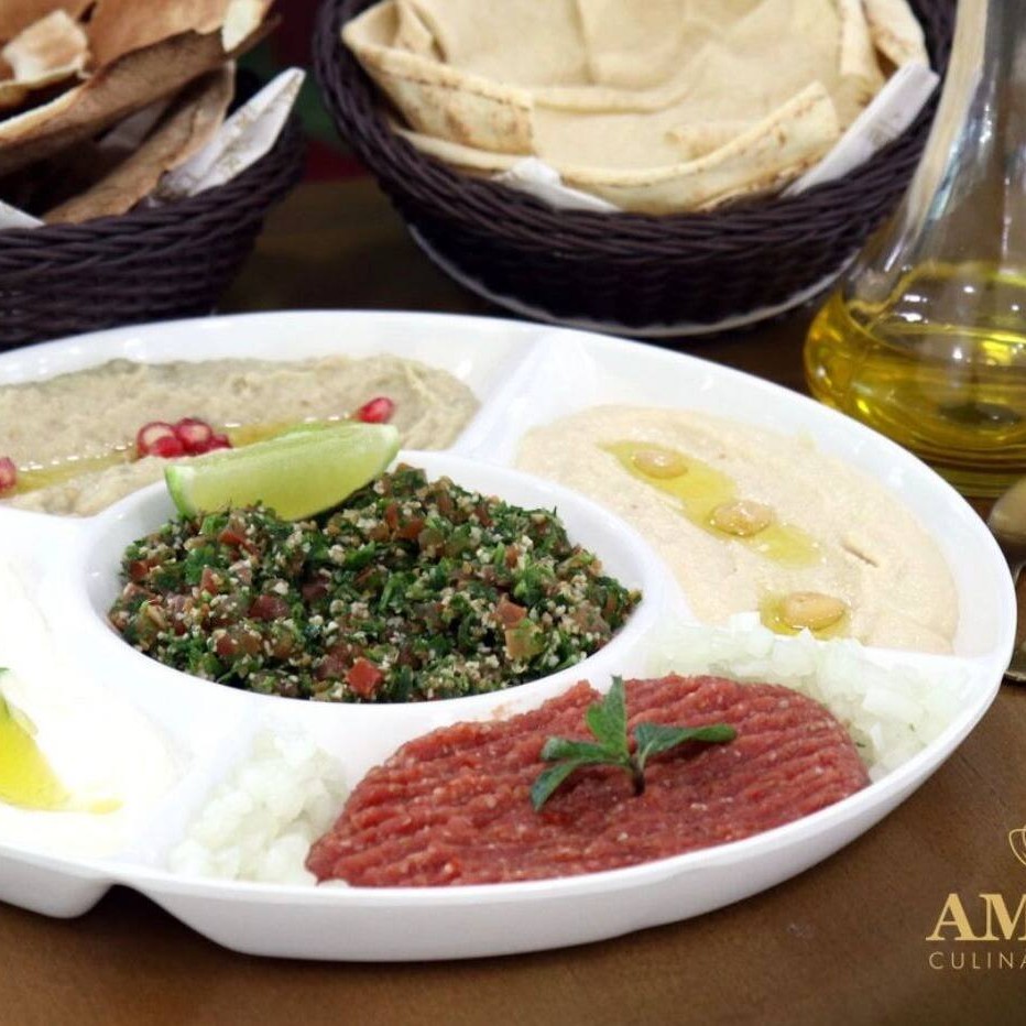125 gramas de coalhada seca, 125 gramas de hommus, 125 gramas de babaganoush, 125 gramas Kibe Cru, 125 gramas de tabule, acompanha pão e torradas arabes
