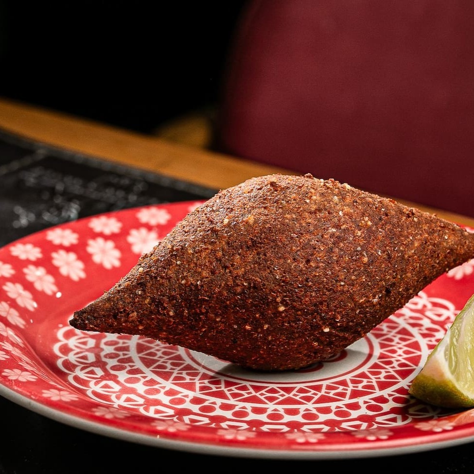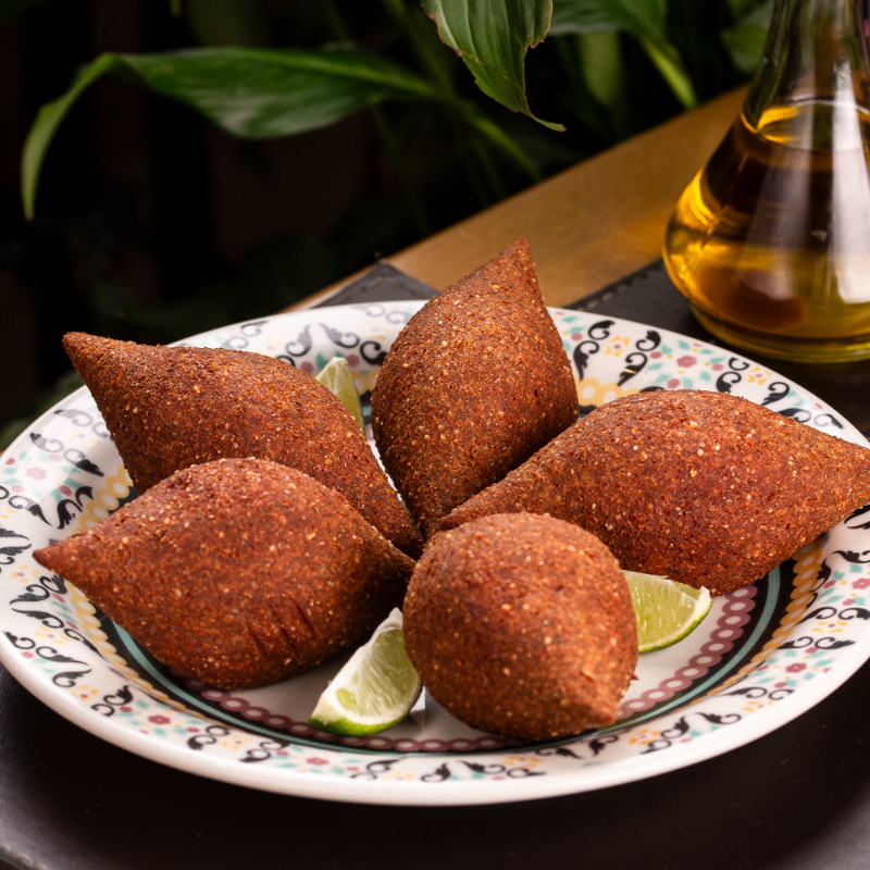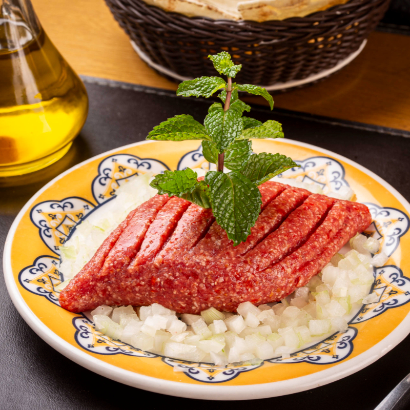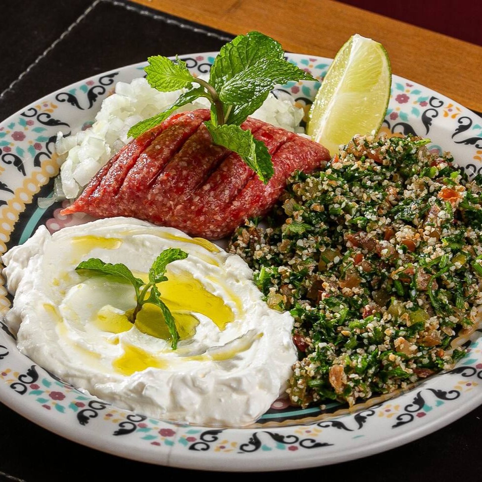Kibe Cru (Cebolo e hortelã), coalhada seca e tabule.