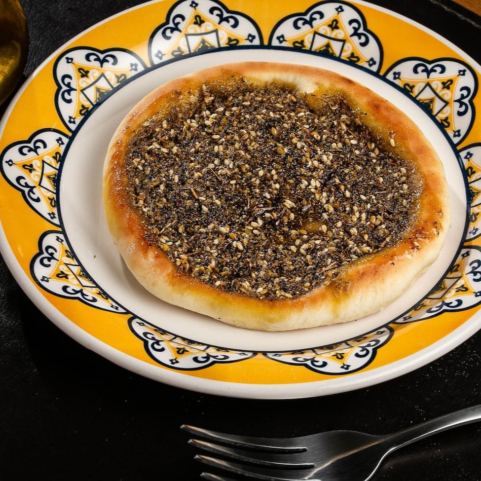 Pão Sírio, Hommus, Cebola crua e Molho Somac