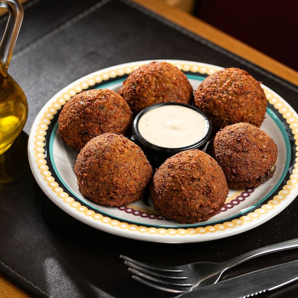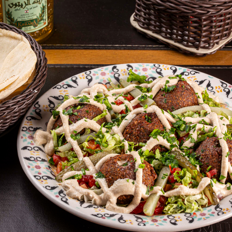 5 bolinhos de falafel, alface, tomate, picles, salsa e molho tahine.