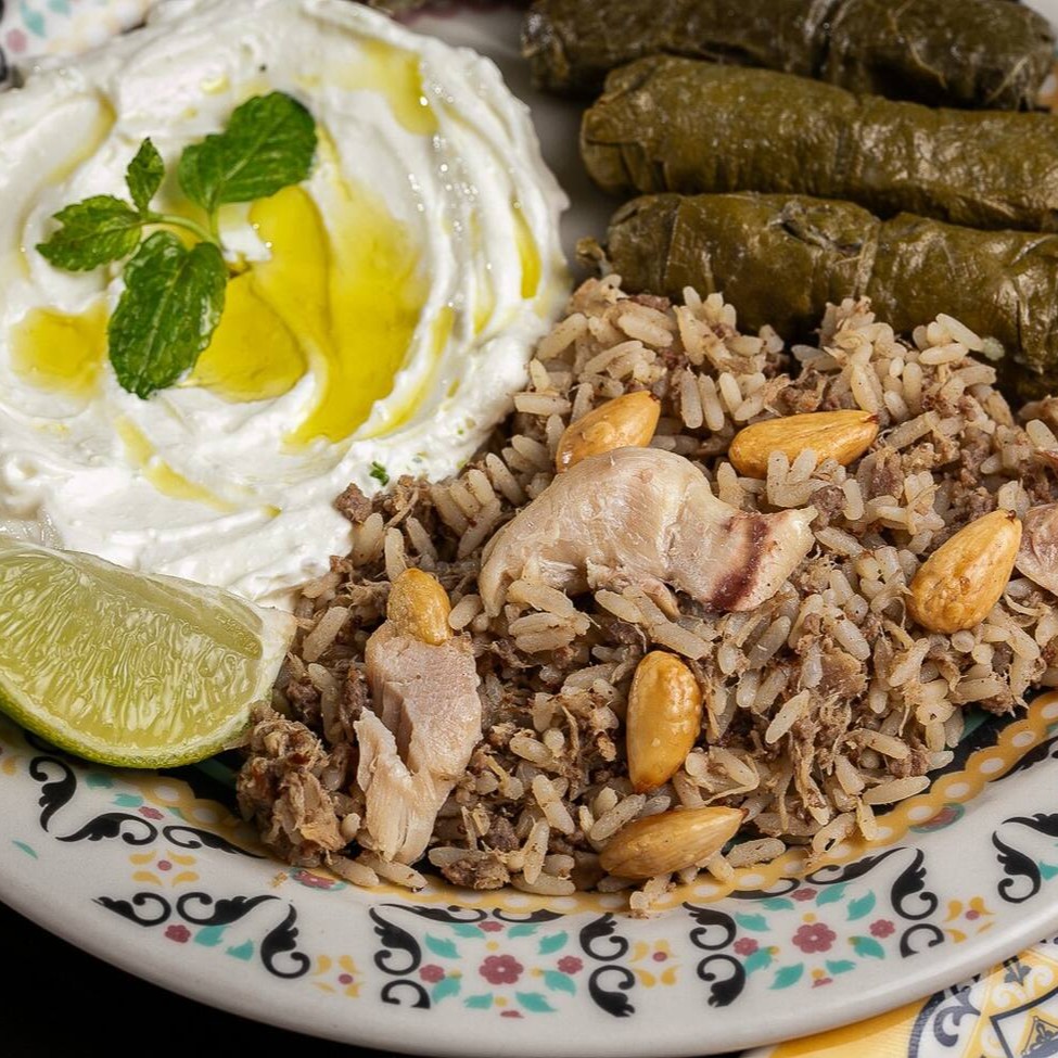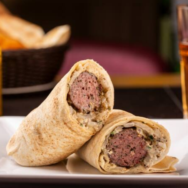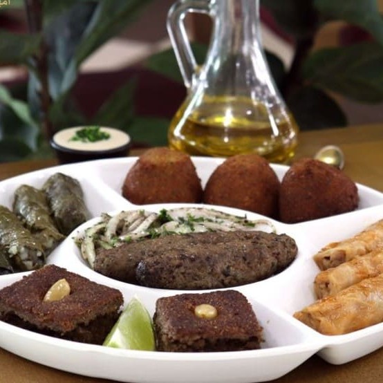 2 mini kafta com cebola temperada 4 charutos de folha de uva 3 charutos de folha de repolho 3 bolinho de falafel com molho tahine aproximadamente 125 gramas de kibe assado