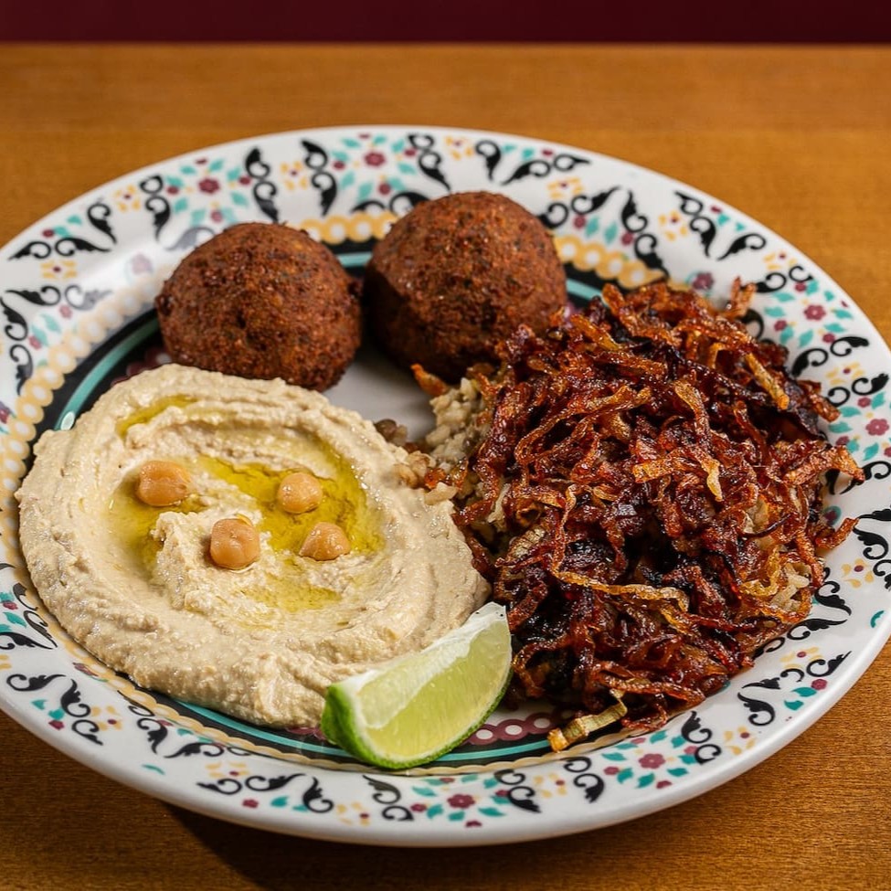 Arroz com lentilha e cebola frita, hommus e 2 bolinhos de falafel.