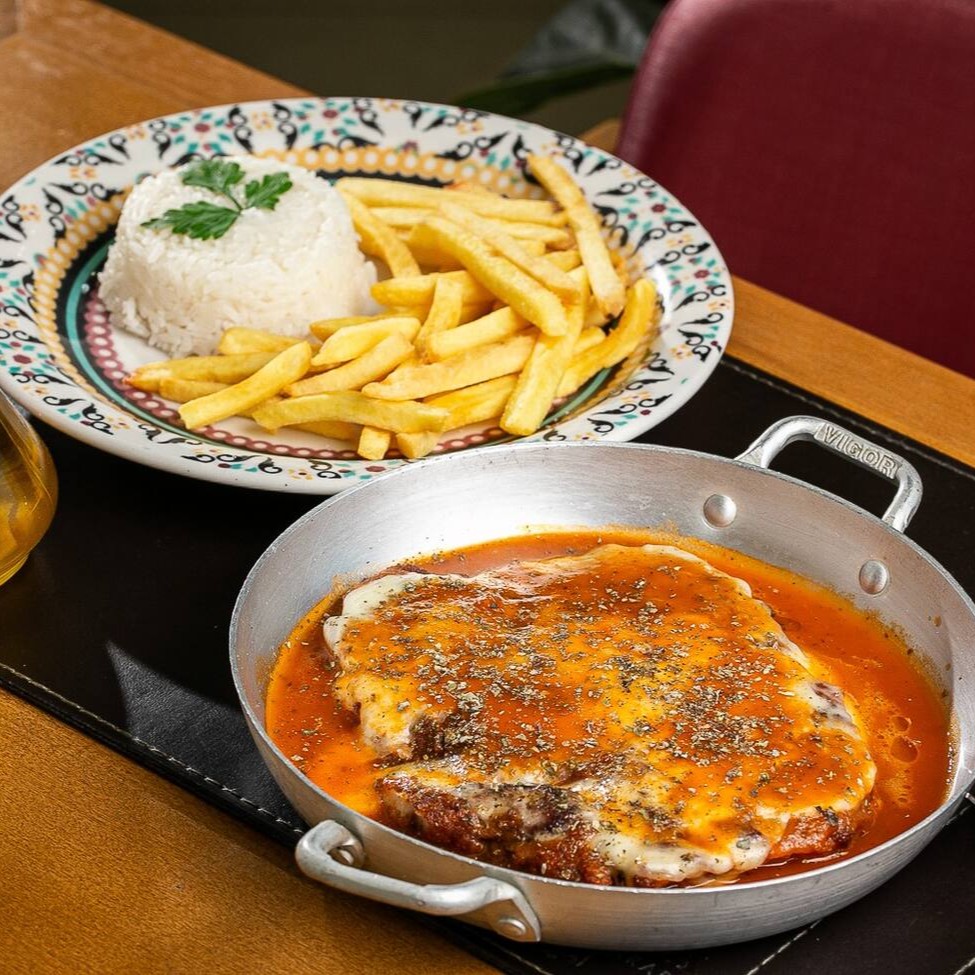 Delicioso filé à parmegiana de carne, acompanha arroz branco e batatas fritas.