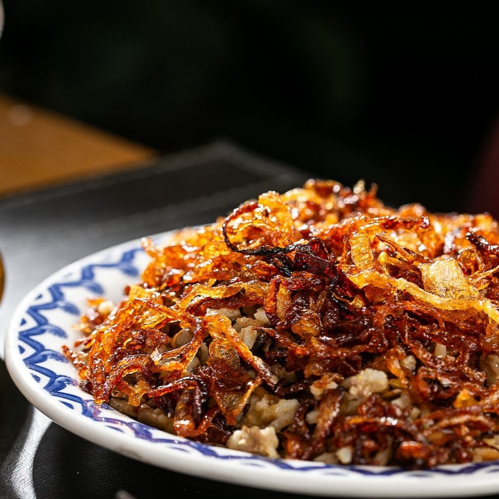 Arroz com lentilha e cebola frita, tabule e 2 mini kafta.