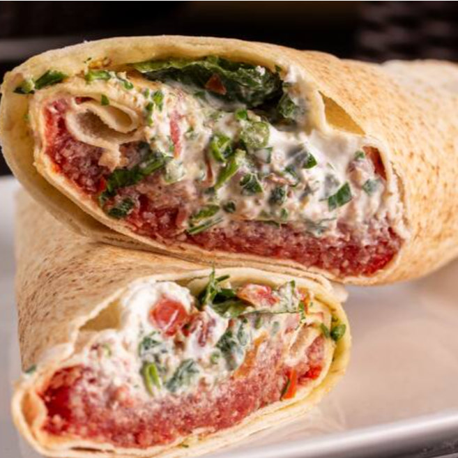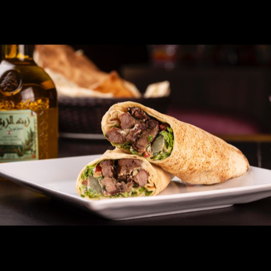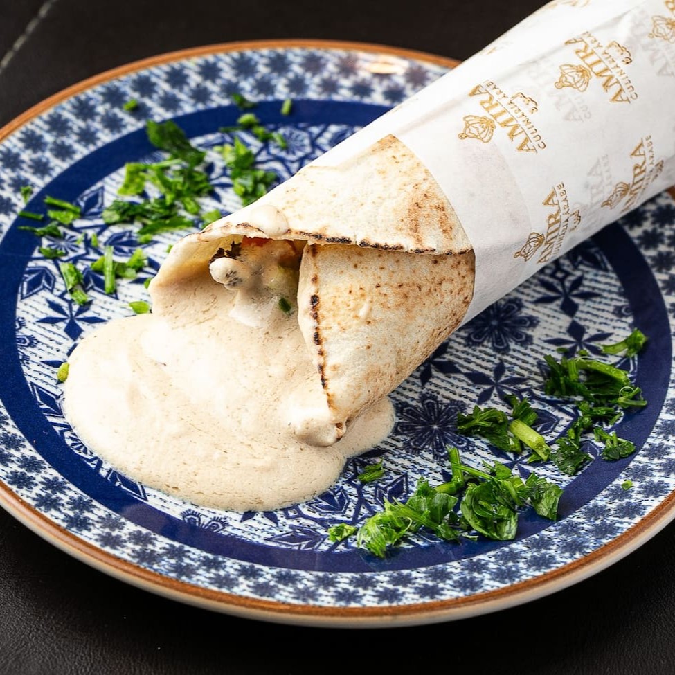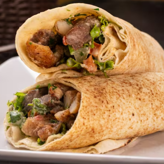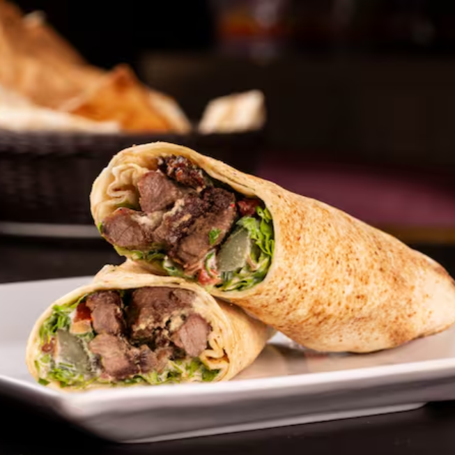 Pão Sírio, Alface, Tomate, Picles, Salsa e molho Tahine.