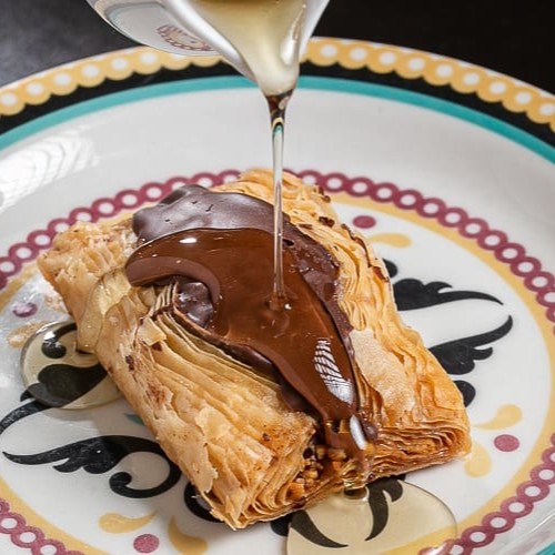 Massa folhada recheada de nozes coberta com geleia de damasco.