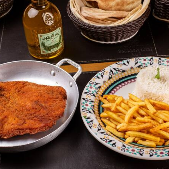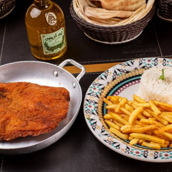 Filé à Milanesa de Frango acompanha arroz e batatas fritas.