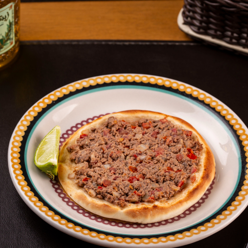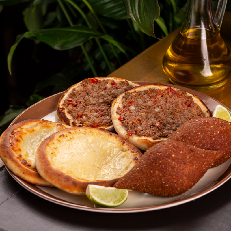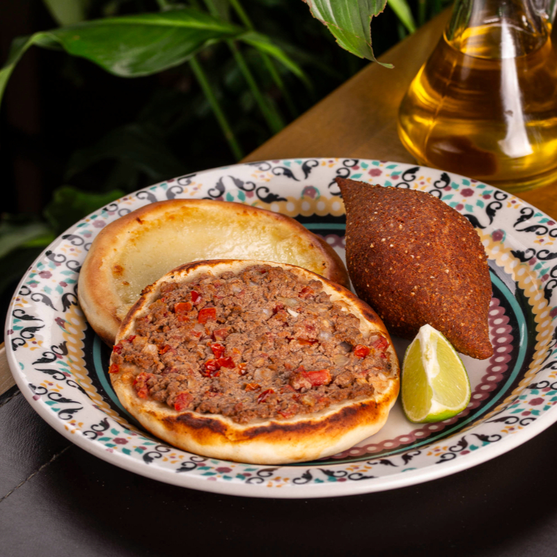 Pão Sírio, kibe cru, coalhada seca, tabule, hortelã e azeite.