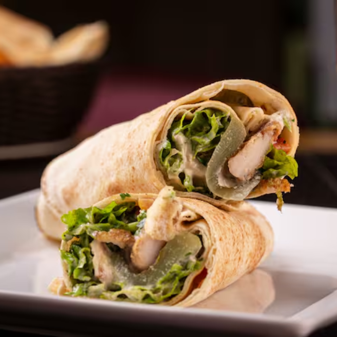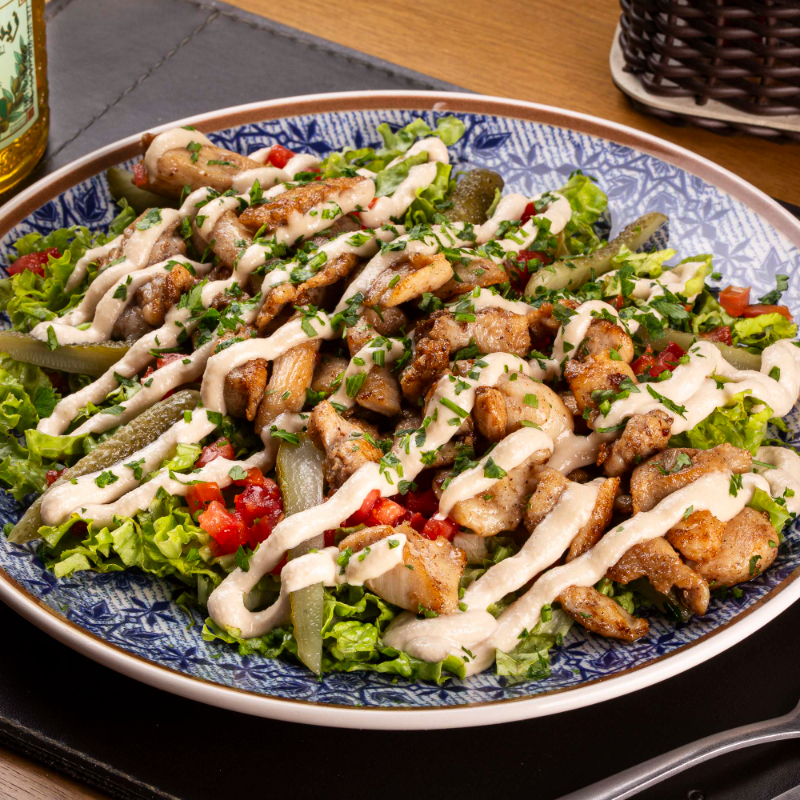 200 gramas de peito de frango em tiras com tempero especial, alface, tomate, picles, salsa e molho tahine.
