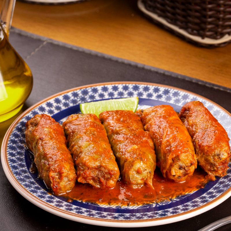 Kibe assado, 4 charutos de folha de uva e 3 charutos de repolho. l