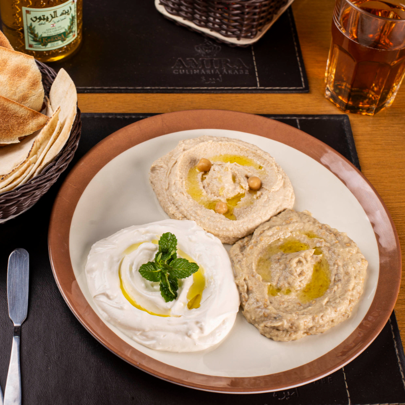 125 gramas de coalhada seca 125 gramas de hommus 125 gramas de babaganoush
