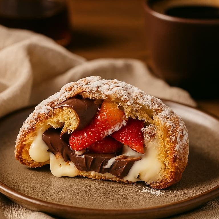 É Ninho, é Nutella, é morango... É felicidade pura dentro dessa casquinha crocante! Nossa choux vem Bem recheadona com mousse de Ninho levinho, Nutella pura (não é creme, é Nutella de verdade!) e morangos fresquinhos picados. Pra finalizar o crime perfeito: polvilhado com uma chuvinha de Ninho em pó, porque exagero de amor nunca é demais, né? Imagem ilustrativa (mas pode confiar que é essa lindez