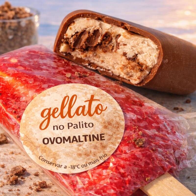 Feito com ingredientes de verdade. Nada industrializado. Nada de nomes estranhos. Aqui é creme de leite fresco, leite condensado e receita artesanal. Com flocos generosos de Ovomaltine, recheio cremoso e muita crocância a cada mordida. É gelato pra fechar o olho e pedir outro.