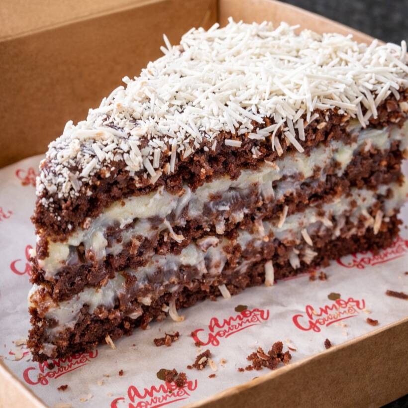 Pra quem acredita que chocolate e coco foram feitos um pro outro... Esse bolo é puro aconchego! Massa de cacau fofinha, molhadinha na medida e recheada com camadas generosas de cocada cremosa e brigadeiro 70% cacau — do jeitinho que aquece o coração. Finalizado com uma chuvinha de coco ralado só pra garantir aquele charme a mais (e um suspiro na primeira mordida!). É tipo Prestígio... Só que mui