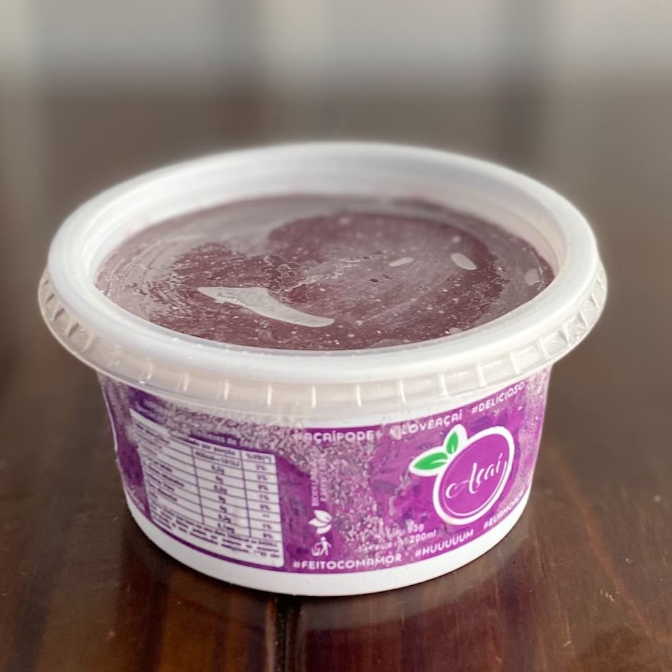 Pote com 200 ml de açaí cremoso e sem cristais de gelo. Adicione acompanhamentos e turbine seu açaí. Obs. os acompanhamentos serão enviados separados em potes de 30 ml
