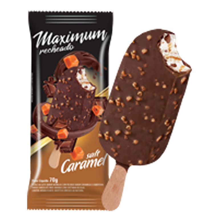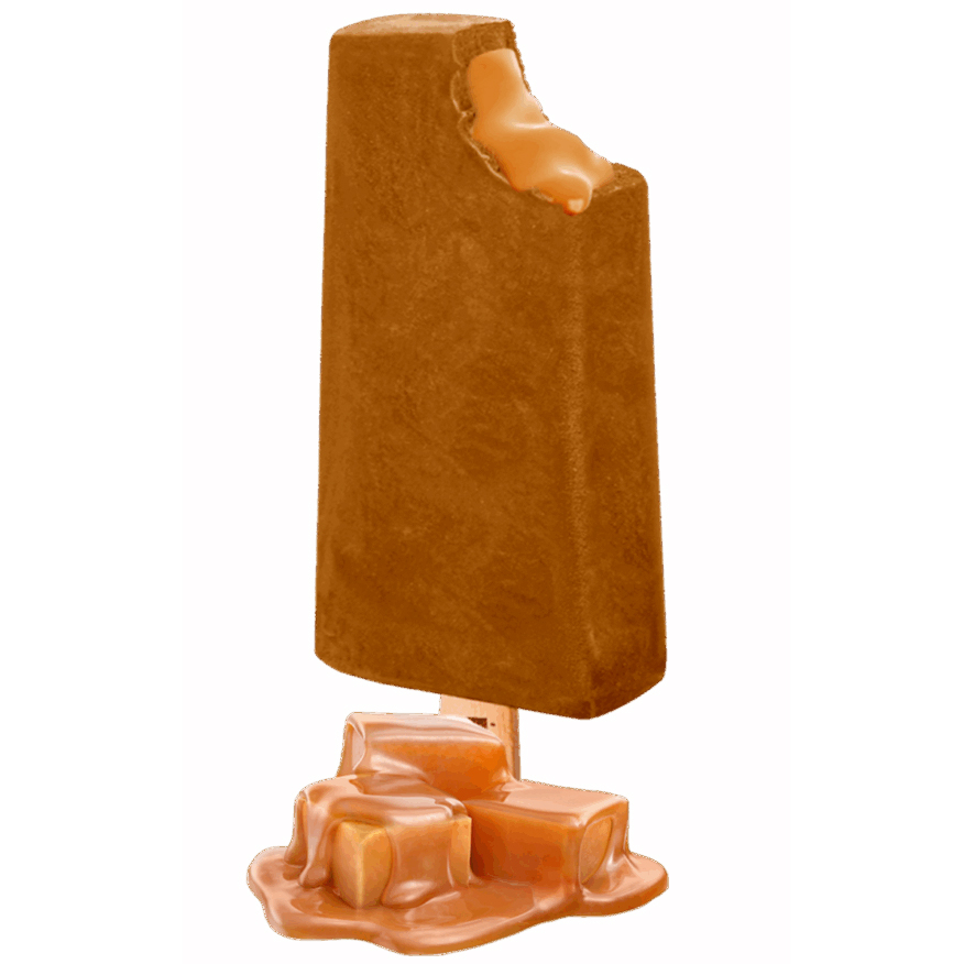 Picolé ao leite sabor baunilha com recheio sabor caramelo e cobertura sabor chocolate meio amargo com castanha de caju