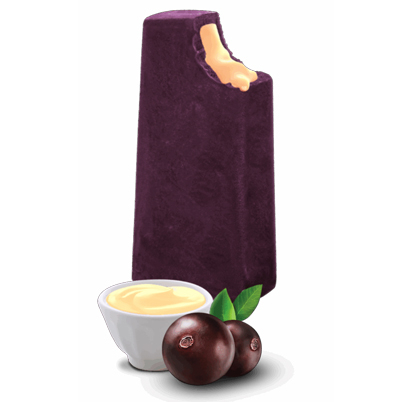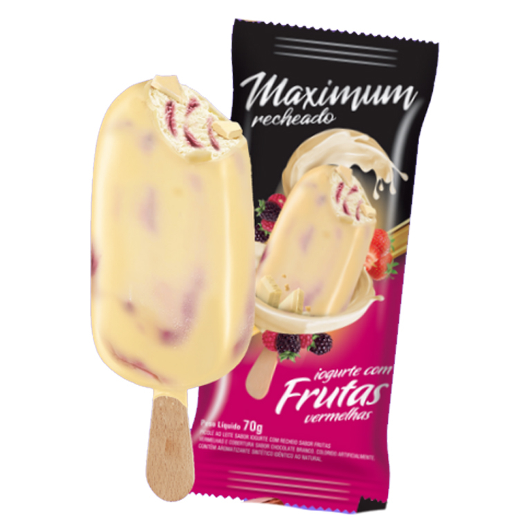 Sorvete sabor iogurte com recheio cremoso de mescla de frutas vermelhas e cobertura de chocolate branco