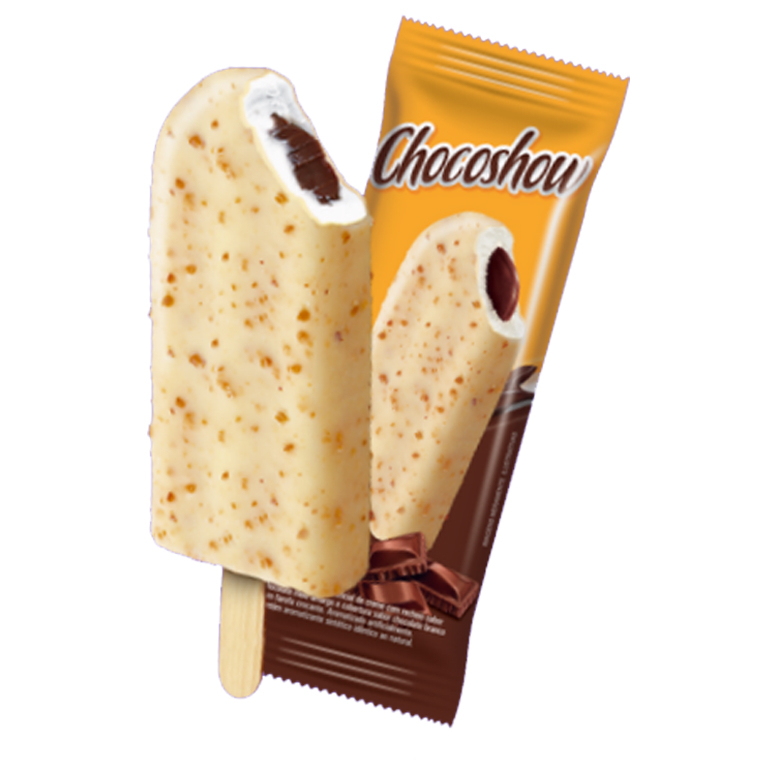 Picolé moldado sabor baunilha com recheio de chocolate e cobertura de chocolate branco com crocantes de castanha de cajú