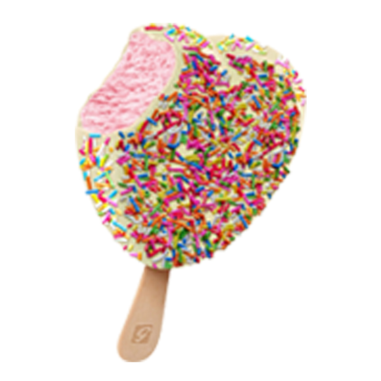 Sorvete no formato de coração sabor morango com cobertura de chocolate branco e confeitos coloridos