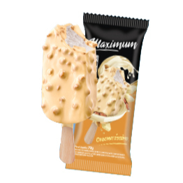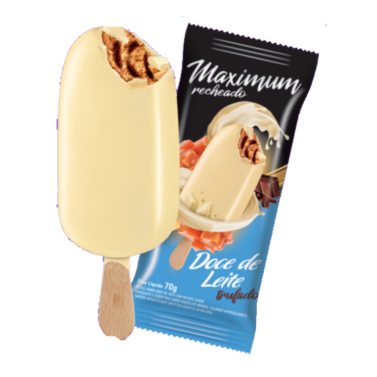 Sorvete sabor doce de leite com recheio cremoso de trufa de chocolate e cobertura de chocolate branco
