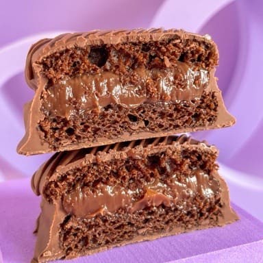 Uma das combinações mais amadas! Massa de chocolate extremamente fofinha, aromatizada com especiarias, recheada com brigadeiro de leite Ninho e Nutella cremosa. Finalizado com cobertura sabor chocolate. Peso médio: 60g