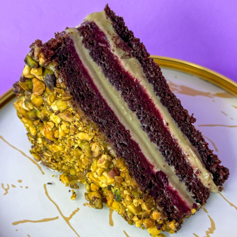 Nossa fatia de bolo de pistache é feita com massa de chocolate fofinha, recheada com geleia de frutas vermelhas e um cremoso brigadeiro de pistache. A combinação perfeita entre o chocolate, o toque levemente ácido das frutas e a cremosidade do pistache. Finalizada com pistaches triturados por cima, trazendo textura e ainda mais sabor. Peso aproximado: 350g