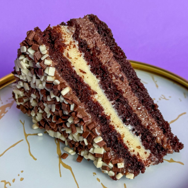 Uma combinação clássica que todo mundo ama! Nossa fatia de bolo Dois Amores é feita com massa de chocolate fofinha, recheada com duas camadas generosas: brigadeiro branco cremoso e brigadeiro ao leite. Para finalizar, cobertura com granulado de chocolate branco e ao leite, trazendo ainda mais sabor e textura. Uma escolha perfeita para quem não abre mão de brigadeiro, nos dois sabores mais amados. Peso aproximado: 300g