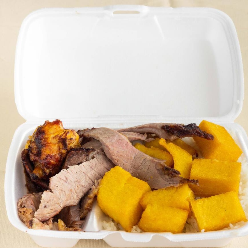 Carne: Alcatra + 2 proteína (Frango ou Linguiça) + 1 acompanhamento (Polenta ou Batata Frita ). Acompanha Arroz e Feijão.