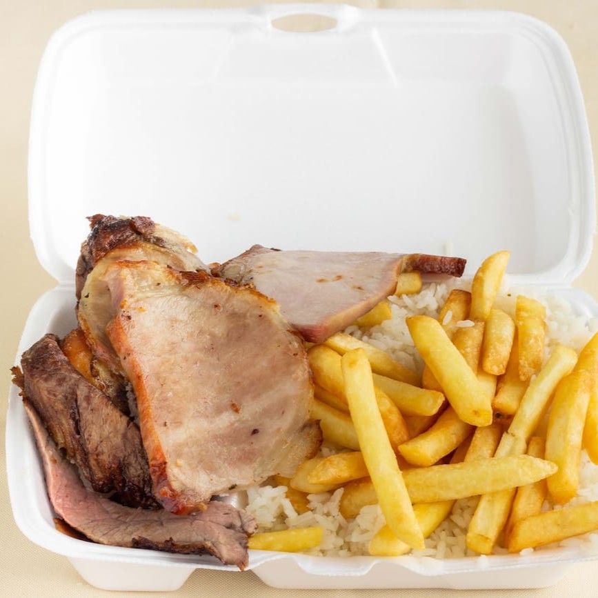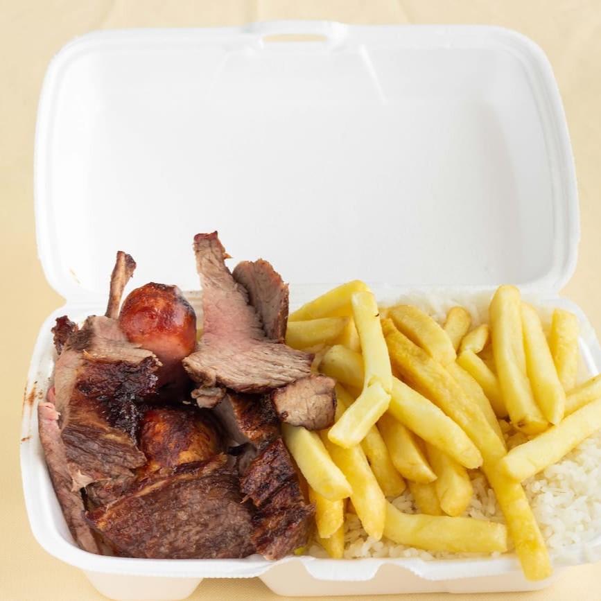 Carnes: Cupim, frango e linguiça. Acompanha Arroz, Feijão e Batata Frita.