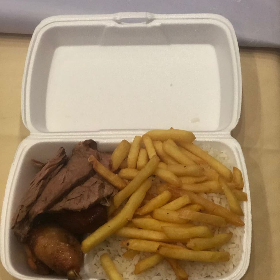Carnes: Maminha, tender e frango. Acompanha Arroz, Feijão e Batata Frita.