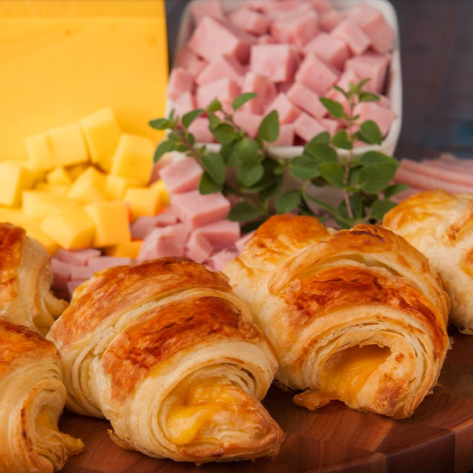 Massa folhada leve e amanteigada recheada com presunto e queijo derretido, formando uma combinação irresistível de sabor e crocância.
